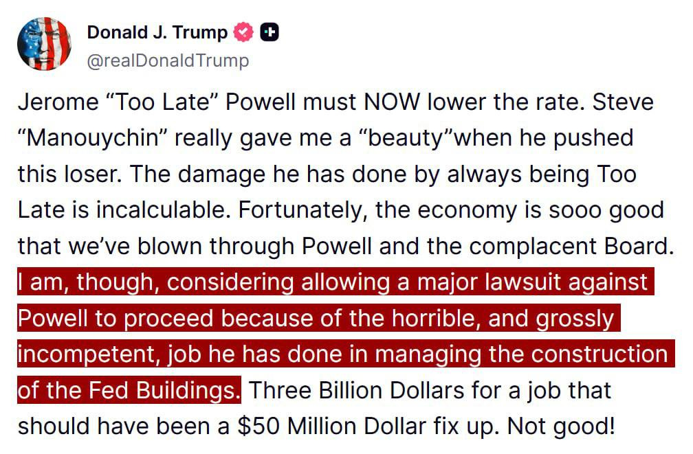 In un continuo contrattacco, il vero Trump ha promesso una “importante causa legale” contro il presidente della Fed per quella che definisce una cattiva gestione “orribile” e “grossolanamente incompetente” di un progetto edilizio della Federal Reserve.