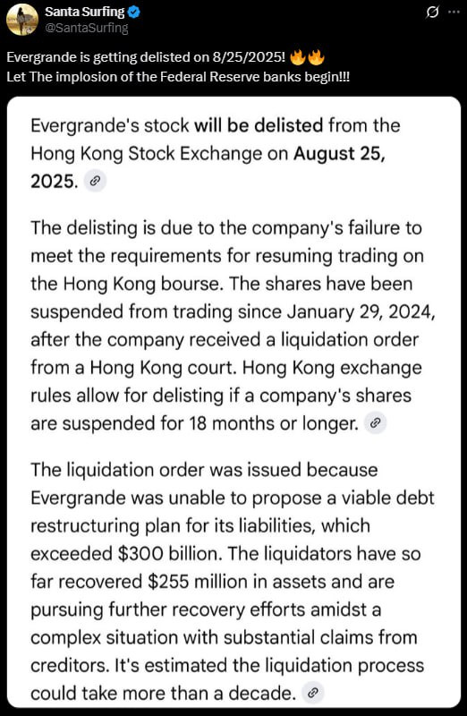 Ne hanno bisogno perché l’implosione delle banche della Federal Reserve è iniziata. Le azioni della società cinese Evergrande, legata a Clinton, saranno ritirate dalla Borsa di Hong Kong il 25 agosto 2025, poiché implodono sotto il peso di 300 miliardi di dollari di debito che non sono in grado di pagare. Questa è solo la punta dell’iceberg, ma 300 miliardi di dollari non sono spiccioli.